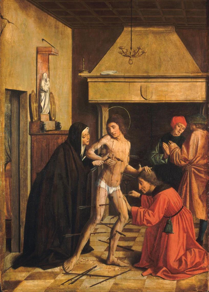 While the martyrdom itself is the most common motif, the scene of Saint Irene tending to Sebastian’s wounds introduces a narrative of resilience and community care. In Josse Lieferinxe’s work, we see a shift from the solitary sufferer to a moment of radical compassion.