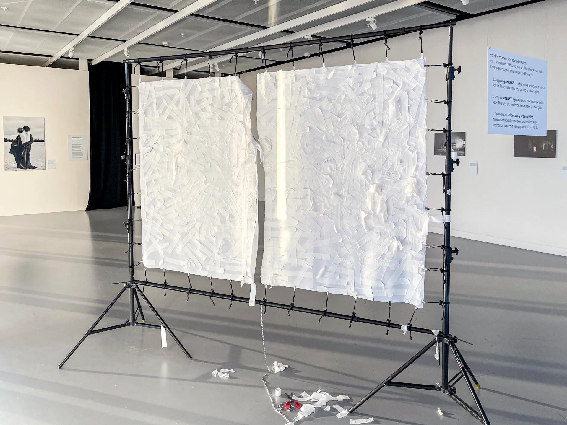 Arjan Spannenburg, an award-winning Dutch fine art photographer and FEP Merit winner celebrated for his raw explorations of identity and human connection, created a pivotal moment in contemporary art history with his installation RESTRAINT. Originally a 200cm monochrome pigment print centerpiece for his People Like Me exhibition at Kunstlinie Almere (October–December 2024), the work was physically vandalized when a visitor severed the canvas, an act that inadvertently manifested the piece's theme of societal pressure on LGBTQ+ intimacy. Rather than retreating, Spannenburg transformed the destruction into a profound "participation artwork," leading a communal restoration joined by Alderman Maaike Veeningen, Meke Smeulders, and Pride Amsterdam chair Suzanna van de Laar. By physically mending the canvas, the community turned a site of violence into a symbol of resilience, leaving the work with a unique provenance that serves as a permanent cultural record of the struggle for LGBTQ+ rights in the Netherlands during the mid-2020s.